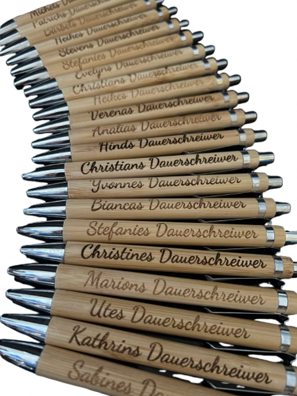 Dieser hochwertige Kugelschreiber aus Bambusholz kann individuell mit einem Namen, kurzen Text oder einer kleinen Botschaft graviert werden. Dadurch entsteht ein persönliches und einzigartiges Geschenk für Familie, Freunde oder Kollegen.